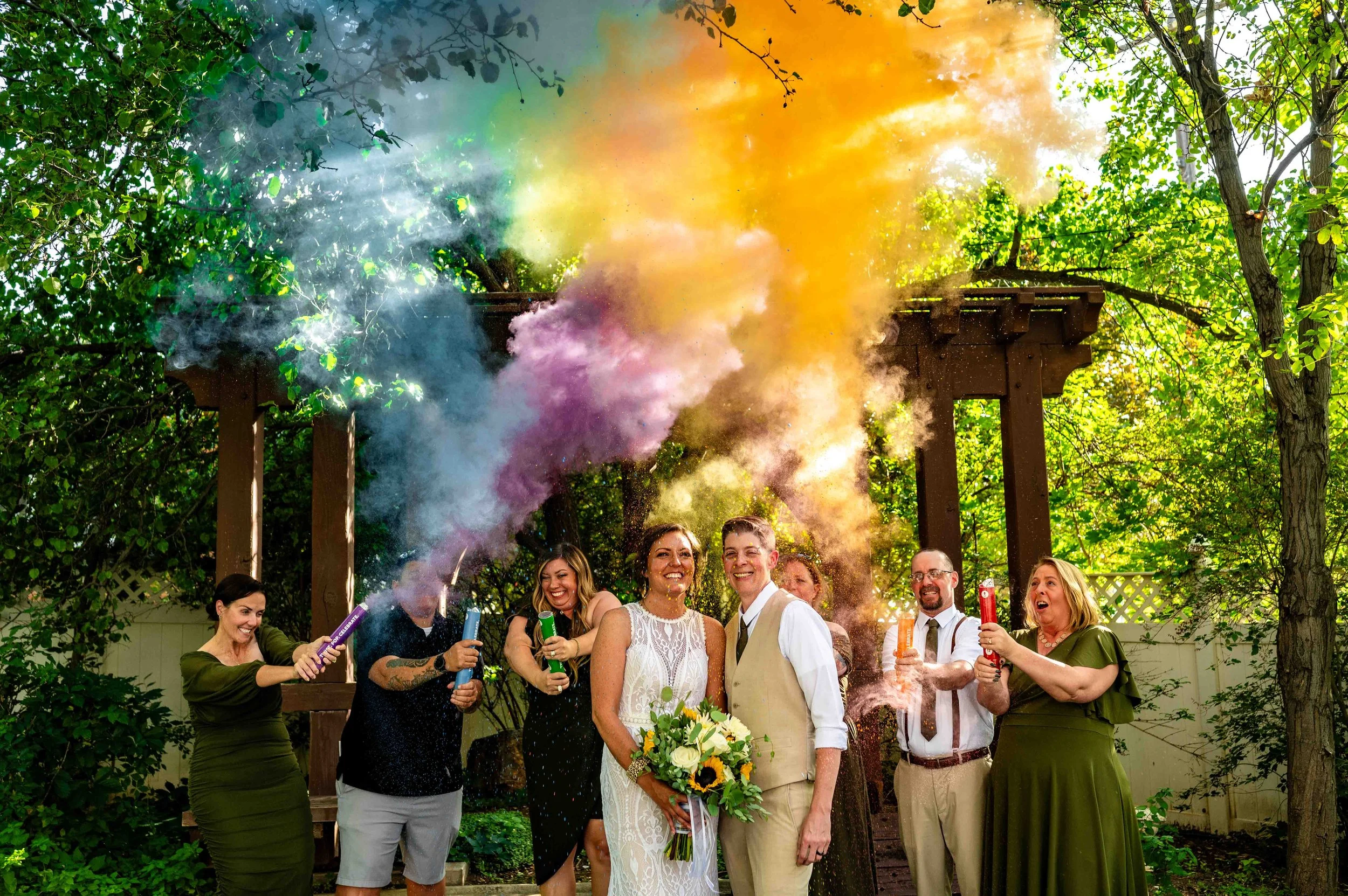 Post-ceremony, the celebration was far from over. Guests mingled in the sunlit garden, where family portraits were taken, and vibrant chalk cannons burst into the air in a rainbow of color, a perfect nod to the couple’s pride and the diversity of their love. Inside the Chillon, people enjoyed drinks, laughter, and conversation as the reception began in full swing.