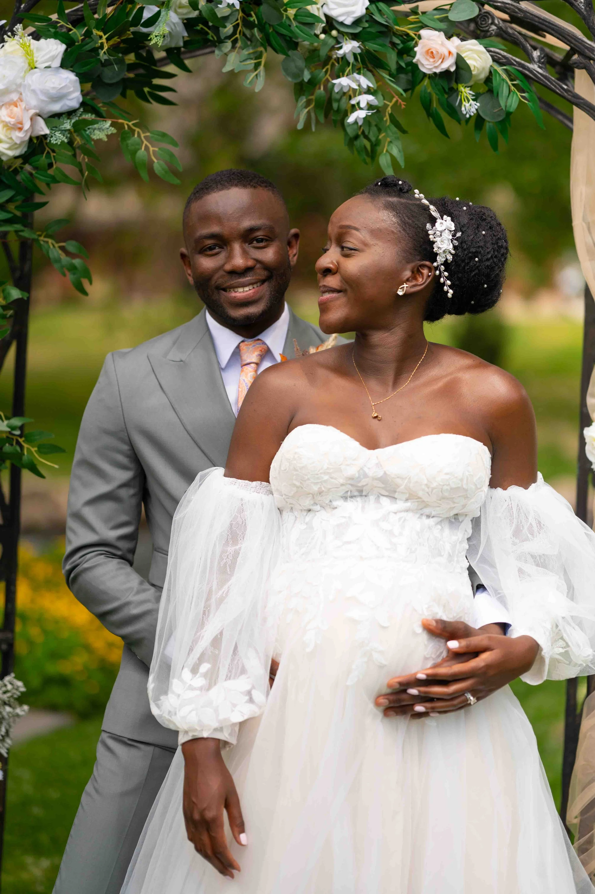 Armela wore a stunning maternity wedding gown, gracefully embracing her radiant glow as a mother-to-be. Her smile lit up the day, effortlessly brightening the already serene garden setting. Meanwhile, Arthur looked every bit the dashing groom in a grey suit, his love and admiration for Armela evident in every glance and smile he sent her way. The elegance of their attire was matched only by the natural beauty surrounding them.
