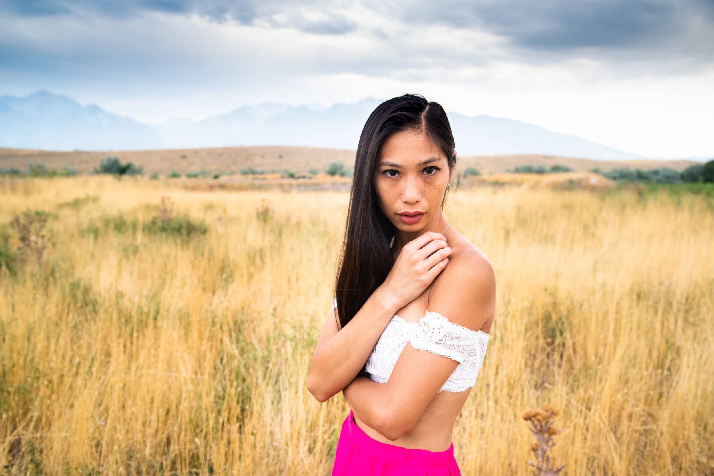 Trang Satterlee in a grass field with Wasatch Mountains in the background.